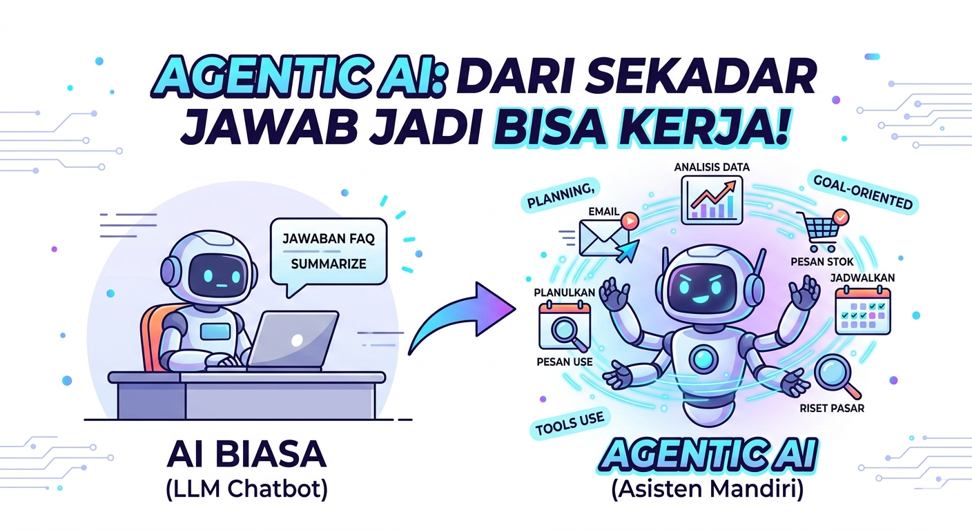 Pernah merasa kalau AI saat ini cuma bisa jawab pertanyaan kalau ditanya? Nah, kenalin Agentic AI, level selanjutnya dari kecerdasan buatan. Kalau AI biasa itu seperti mesin pencari yang pintar, Agentic AI itu ibarat punya “asisten digital” yang punya inisiatif. Dia nggak cuma ngasih jawaban, tapi bisa merencanakan tugas, pakai alat digital lain, dan menyelesaikan kerjaan sampai beres tanpa perlu kita tuntun terus-menerus.